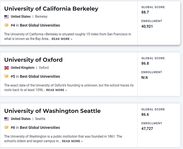 每年选择前往海外留学的学生都根据权威排名作为择校风向标,虽然于U.S. News 2014年才推出全球性大学排名,但拥有三十余年的全美排名积淀,已经成为“权威专业”的代名词,与泰晤士高等教育世界大学排名、QS世界大学排名、软科世界大学学术排名为公认的四大较为权威的世界大学排名。