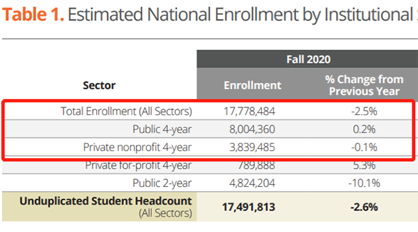 据统计,2020年秋季,约有1,778万本科新生入学。其中,非盈利四年制私立大学招收约384万学生,约占总新生人数22%;而四年制公立大学接纳了约800万学生,约占总新生人数45%。