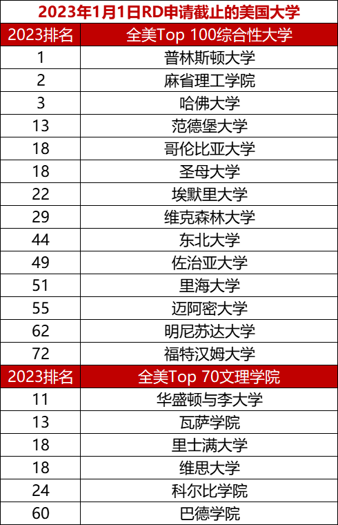 RD阶段,有14所Top100综合大学在1月1日截止申请,包括普林斯顿大学、麻省理工学院、哈佛大学等顶尖校,从这几所学校前几天公布的早申数据来看,今年的形势不容乐观,如果想冲名校的话,建议大家再认真打磨一下活动列表和文书,争取在RD阶段拿下理想录取。