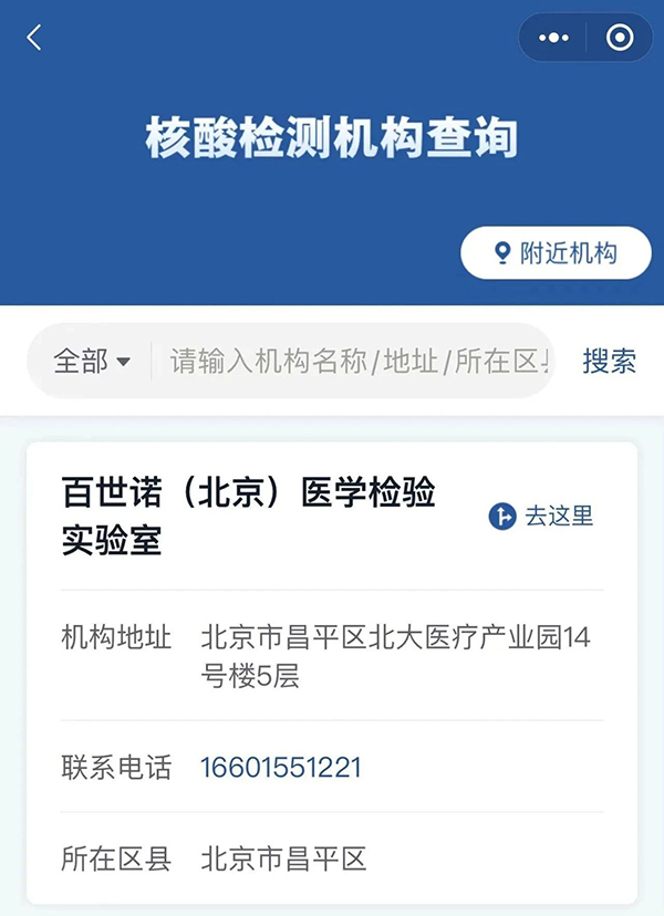 3. 输入所在城市或者点击“附近机构”查看您附近的核酸检测机构信息: