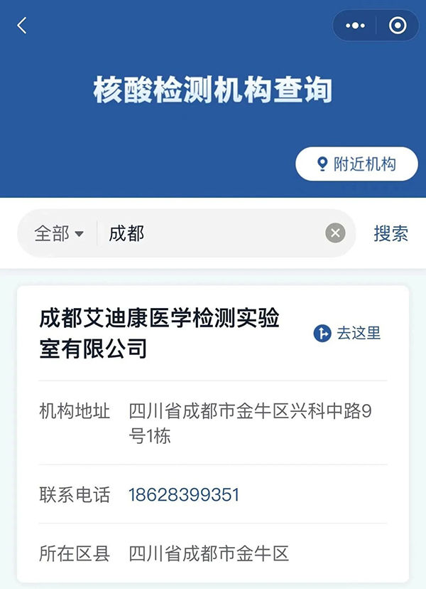 4.输入所在城市或者点击“附近机构”查看附近的核酸检测机构,查询后,需要自行电话询问是否能提供英文检测报告