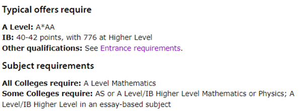 A-Level:A*AA,包括数学A*;物理、化学、生物或进阶数学A;其他科学科目或商务、经济、计算机或进阶数学A;